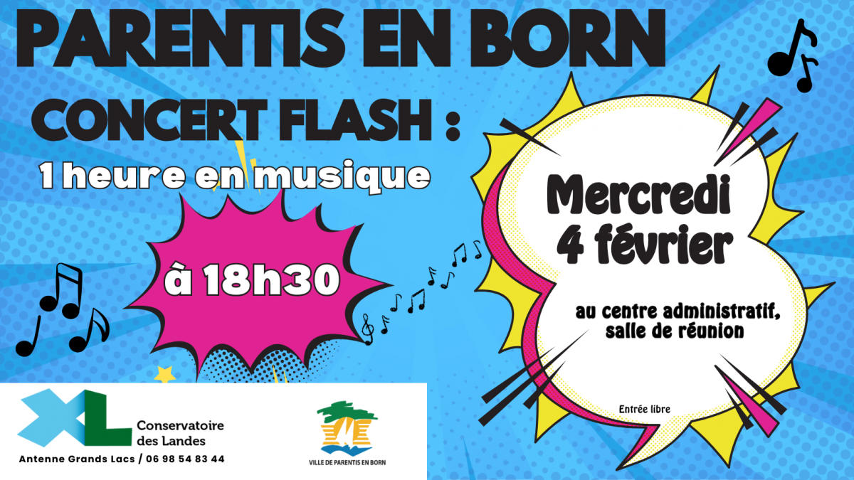 [ANTENNE GRANDS LACS] PARENTIS EN BORN-CONCERT FLASH [ANTENNE GRANDS LACS] PARENTIS EN BORN-CONCERT FLASH Publié le 09 janvier 2026 / Dernière modification le 09 janvier 2026 [ANTENNE GRANDS LACS] PARENTIS EN BORN-CONCERT FLASH Publié le 09/01/2026 - Dernière modification le 09/01/2026 Le mercredi 04 février 2026 de 12:00 à 23:59 Venez partager 1 heure de musique avec nos élèves ! En prestation individuelle ou en petit ensemble, ils sauront vous charmer.