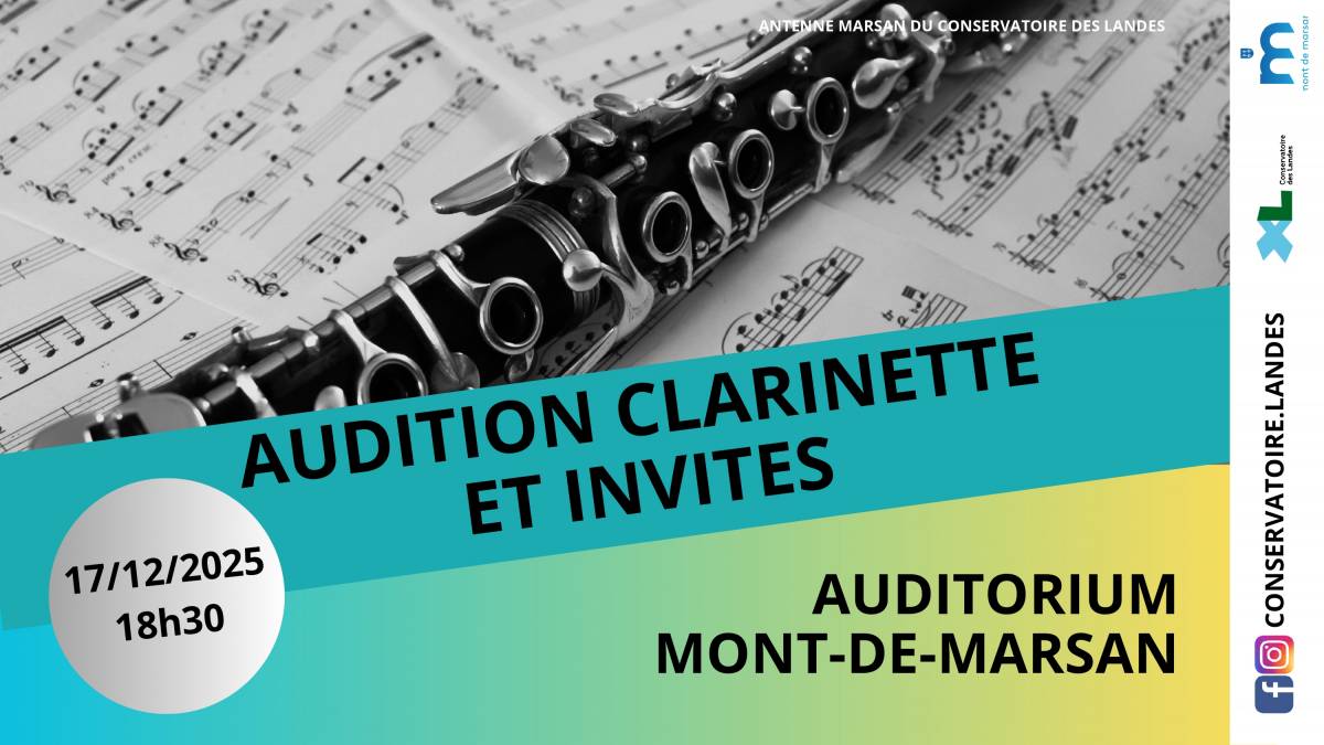 [ANTENNE MARSAN] AUDITION CLARINETTE ET INVITES [ANTENNE MARSAN] AUDITION CLARINETTE ET INVITES Publié le 07 novembre 2025 / Dernière modification le 07 novembre 2025 [ANTENNE MARSAN] AUDITION CLARINETTE ET INVITES Publié le 07/11/2025 - Dernière modification le 07/11/2025 Le mercredi 17 décembre 2025 de 18:30 à 19:30 Venez partager ce moment musical avec nos élèves de l'antenne Marsan !