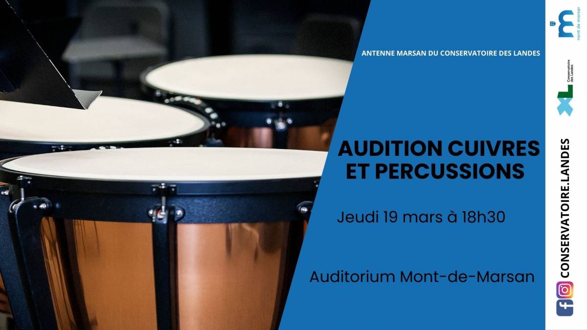 [ANTENNE MARSAN] AUDITION CUIVRES ET PERCUSSIONS [ANTENNE MARSAN] AUDITION CUIVRES ET PERCUSSIONS Publié le 13 février 2026 / Dernière modification le 13 février 2026 [ANTENNE MARSAN] AUDITION CUIVRES ET PERCUSSIONS Publié le 13/02/2026 - Dernière modification le 13/02/2026 Le jeudi 19 mars 2026 de 18:30 à 19:30 Nos élèves sont heureux de vous présenter leur travail !
