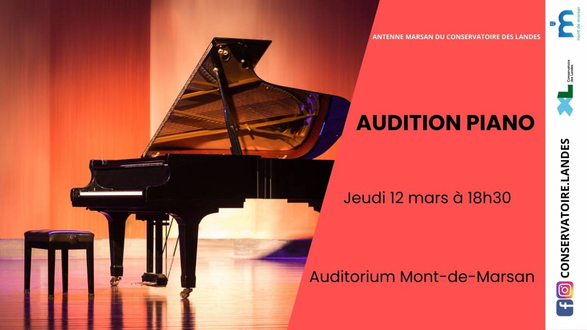 [ANTENNE MARSAN] AUDITION PIANO [ANTENNE MARSAN] AUDITION PIANO Publié le 13 février 2026 / Dernière modification le 13 février 2026 [ANTENNE MARSAN] AUDITION PIANO Publié le 13/02/2026 - Dernière modification le 13/02/2026 Le jeudi 12 mars 2026 de 18:30 à 19:30 Venez partager ce moment musical avec nos élèves de la classe piano !