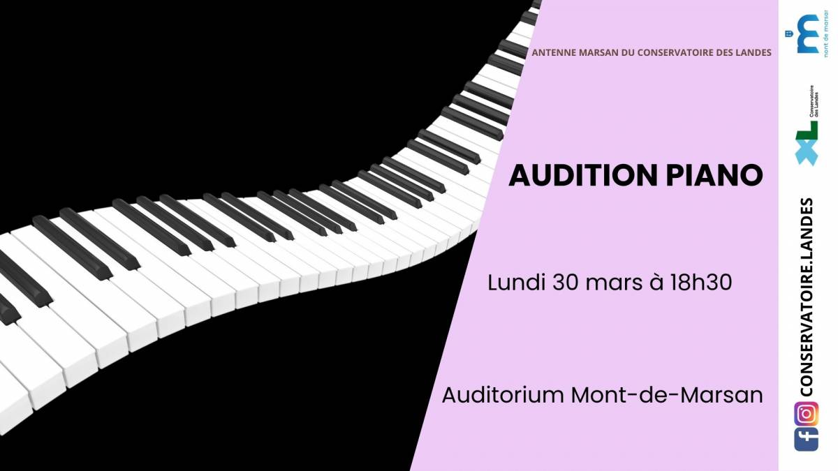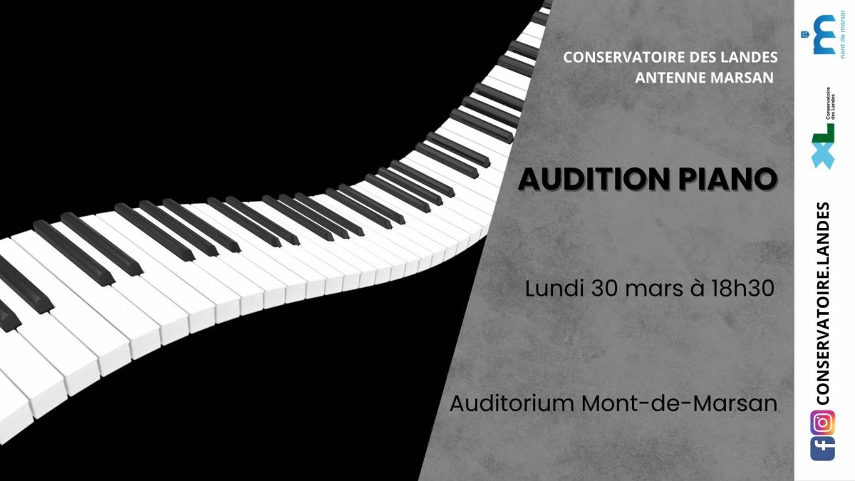 [ANTENNE MARSAN] AUDITION PIANO [ANTENNE MARSAN] AUDITION PIANO Publié le 13 février 2026 / Dernière modification le 13 février 2026 [ANTENNE MARSAN] AUDITION PIANO Publié le 13/02/2026 - Dernière modification le 13/02/2026 Le lundi 30 mars 2026 de 18:30 à 19:30 Venez partager ce moment musical avec nos élèves de la classe piano !