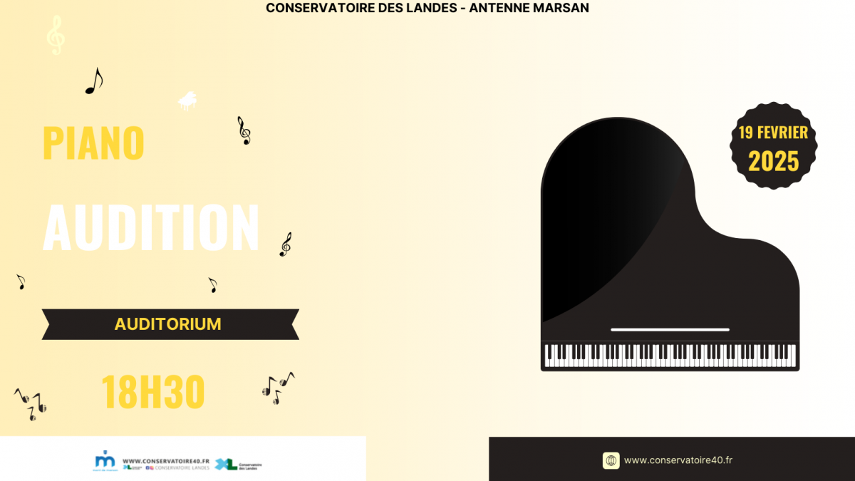 [ANTENNE MARSAN] AUDITION PIANO [ANTENNE MARSAN] AUDITION PIANO Publié le 18 décembre 2024 / Dernière modification le 27 janvier 2025 [ANTENNE MARSAN] AUDITION PIANO Publié le 18/12/2024 - Dernière modification le 27/01/2025 Nos pianistes sont heureux de vous présenter leur travail Venez partager ce moment musical avec eux !