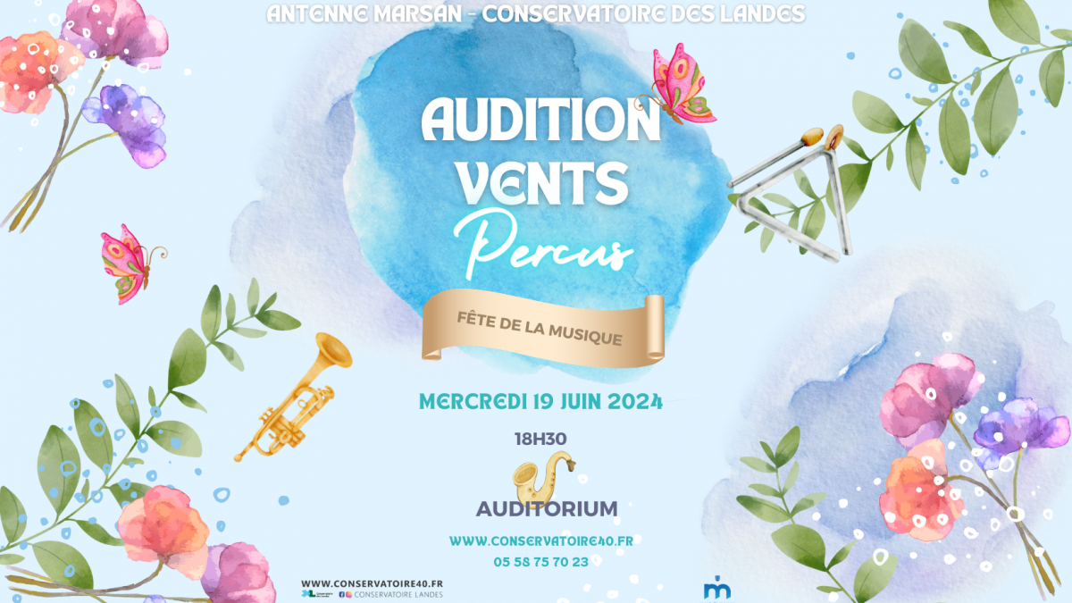 [ANTENNE MARSAN] Audition Vents Percus [ANTENNE MARSAN] Audition Vents Percus Publié le 17 avril 2024 / Dernière modification le 17 avril 2024 [ANTENNE MARSAN] Audition Vents Percus Publié le 17/04/2024 - Dernière modification le 17/04/2024 Parce que les auditions sont importantes dans l'apprentissage de la musique. Venez écouter nos élèves de Mont de Marsan.