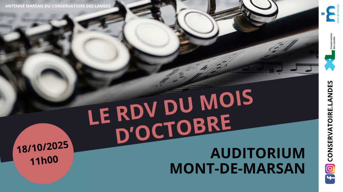 [ANTENNE MARSAN] LE RENDEZ-VOUS D'OCTOBRE [ANTENNE MARSAN] LE RENDEZ-VOUS D'OCTOBRE Publié le 10 octobre 2025 / Dernière modification le 13 octobre 2025 [ANTENNE MARSAN] LE RENDEZ-VOUS D'OCTOBRE Publié le 10/10/2025 - Dernière modification le 13/10/2025 Le samedi 18 octobre 2025 de 11:00 à 12:00 Nos élèves de l'antenne Marsan sont heureux de vous accueillir pour la première audition de l'année Venez partager ce moment musical avec eux !