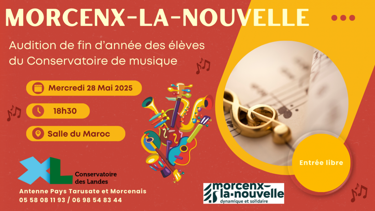 [ANTENNE PTM] AUDITION DE FIN D'ANNEE CONSERVATOIRE DES LANDES - AUDITION DE FIN D'ANNEE [ANTENNE PTM] AUDITION DE FIN D'ANNEE Publié le 16 avril 2025 / Dernière modification le 24 avril 2025 [ANTENNE PTM] AUDITION DE FIN D'ANNEE Publié le 16/04/2025 - Dernière modification le 24/04/2025 Les élèves de MORCENX-LA-NOUVELLE vous présenteront leur travail de toute l'année. ChoraleEnsemble de CuivresEnsemble de BoisOrchestre Junior1ères notes à 18h30 !!