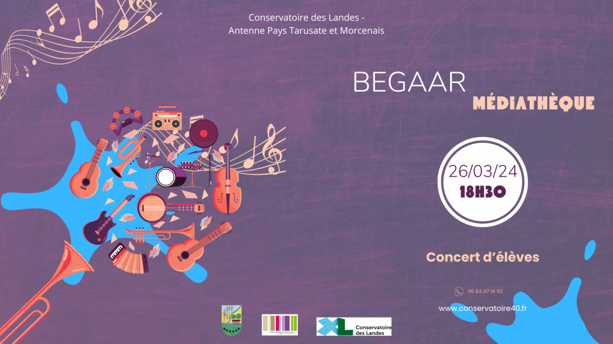 [ANTENNE PTM] Concert Conservatoire des Landes - Concert d'élèves à Bégaar [ANTENNE PTM] Concert Publié le 07 mars 2024 / Dernière modification le 26 mars 2024 [ANTENNE PTM] Concert Publié le 07/03/2024 - Dernière modification le 26/03/2024 Parce que les auditions sont importantes dans l'apprentissage de la musique. Venez écouter nos élèves du Pays Tarusate