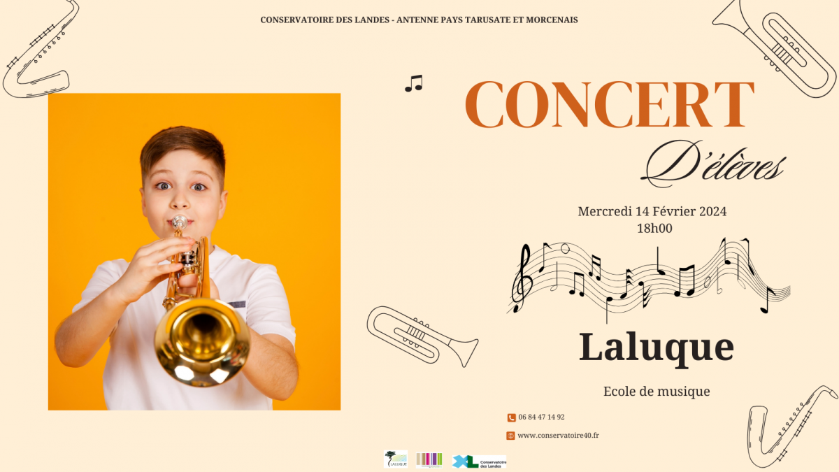 [ANTENNE PTM] Concert d'élèves de Laluque Conservatoire des Landes - Concert d'élèves de Laluque [ANTENNE PTM] Concert d'élèves de Laluque Publié le 10 janvier 2024 / Dernière modification le 15 janvier 2024 [ANTENNE PTM] Concert d'élèves de Laluque Publié le 10/01/2024 - Dernière modification le 15/01/2024 C'est au tour des élèves de Laluque de se produire ! Au programme, des cuivres, des bois, des percussions ...