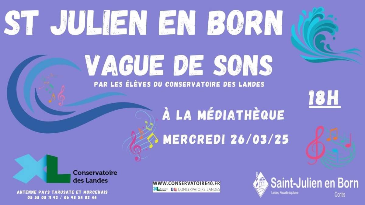 [ANTENNE PTM] VAGUE DE SONS [ANTENNE PTM] VAGUE DE SONS Publié le 11 février 2025 / Dernière modification le 14 février 2025 [ANTENNE PTM] VAGUE DE SONS Publié le 11/02/2025 - Dernière modification le 14/02/2025 Audition des élèves du Conservatoire des Landes de ST-JULIEN en BORN Différentes classes d'instruments seront représentées.Mercredi 26 Mars, rdv à 18h à la médiathèque.