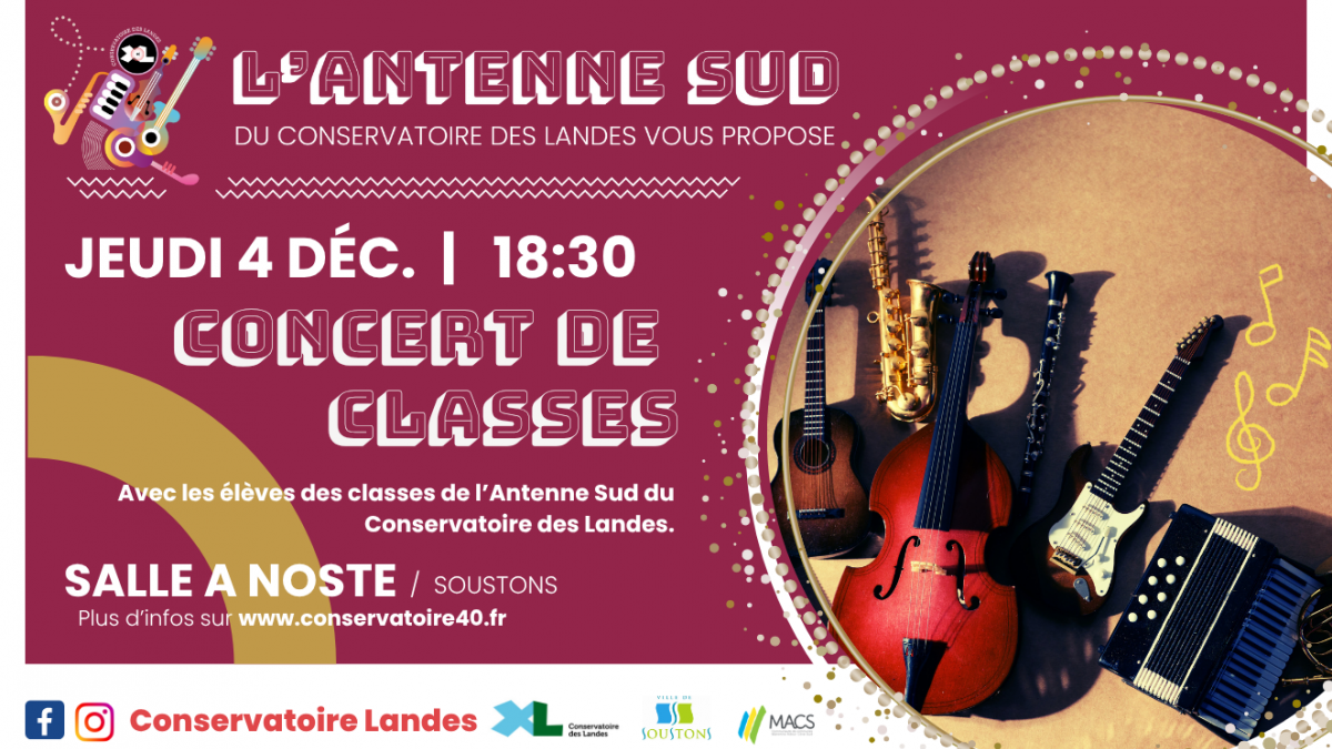 Les élèves des classes de Soustons de l'Antenne Sud du CDL sont heureux de vous présenter leur concert de fin d'année. Nous vous donnons RDV Salle A Noste pour l'occasion !