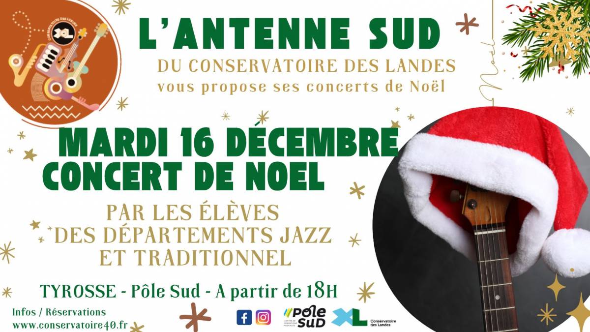 [ANTENNE SUD] CONCERT DE NOËL JAZZ ET MUSIQUE TRADITIONNELLE [ANTENNE SUD] CONCERT DE NOËL JAZZ ET MUSIQUE TRADITIONNELLE Publié le 06 novembre 2025 / Dernière modification le 21 novembre 2025 [ANTENNE SUD] CONCERT DE NOËL JAZZ ET MUSIQUE TRADITIONNELLE Publié le 06/11/2025 - Dernière modification le 21/11/2025 Le mardi 16 décembre 2025 de 18:00 à 20:00 L'Antenne Sud du Conservatoire des Landes vous propose ses concerts de Noël. Venez Fêter en musique les fêtes de fin d'année ! Billetterie Weezevent