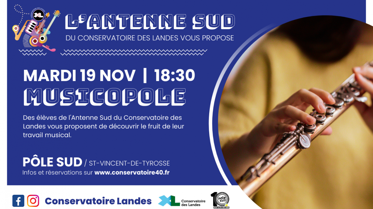 [ANTENNE SUD] CONCERT "MUSICOPOLE" [ANTENNE SUD] CONCERT "MUSICOPOLE" Publié le 17 octobre 2024 / Dernière modification le 17 octobre 2024 [ANTENNE SUD] CONCERT "MUSICOPOLE" Publié le 17/10/2024 - Dernière modification le 17/10/2024 Des élèves de l'Antenne Sud du Conservatoire des Landes vous proposent de découvrir le fruit de leur travail musical. Au programme de la flûte, du piano et du trombone !Réservation obligatoire Billetterie Weezevent