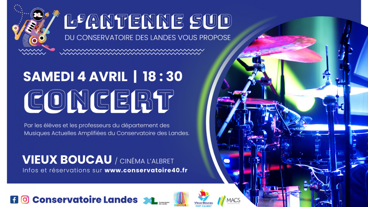 [ANTENNE SUD] CONCERT MUSIQUES ACTUELLES [ANTENNE SUD] CONCERT MUSIQUES ACTUELLES Publié le 06 février 2026 / Dernière modification le 06 février 2026 [ANTENNE SUD] CONCERT MUSIQUES ACTUELLES Publié le 06/02/2026 - Dernière modification le 06/02/2026 Le samedi 04 avril 2026 de 18:30 à 20:30 Les élèves de l'Antenne Sud du département des Musiques Actuelles Amplifiées et leurs professeurs vous présentent leur concert de fin d'année ! Billetterie Weezevent