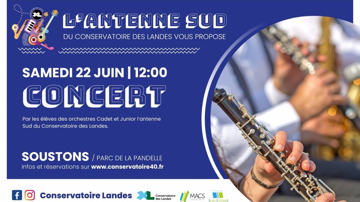[ANTENNE SUD] Concert orchestres Conservatoire des Landes - Concert orchestres - Parc Pandelle - Soustons - Samedi 22 juin - 12h [ANTENNE SUD] Concert orchestres Publié le 29 mai 2024 / Dernière modification le 29 mai 2024 [ANTENNE SUD] Concert orchestres Publié le 29/05/2024 - Dernière modification le 29/05/2024 Par les élèves des orchestres Cadet et Junior de l'antenne Sud du Conservatoire des Landes, au Parc de la Pandelle à Soustons.
