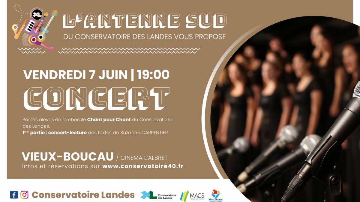 [ANTENNE SUD] Concert Vieux-Boucau Conservatoire des Landes - Concert - Vieux-Boucau - Vendredi 7 juin 2024 - 20h30 [ANTENNE SUD] Concert Vieux-Boucau Publié le 20 mars 2024 / Dernière modification le 20 mars 2024 [ANTENNE SUD] Concert Vieux-Boucau Publié le 20/03/2024 - Dernière modification le 20/03/2024 Par les élèves de la chorale Chant pour Chant du Conservatoire des Landes. 1ère partie : concert-lecture des textes de Suzanne CARPENTIER, boucalaise. Réservation obligatoire : Billetterie Weezevent