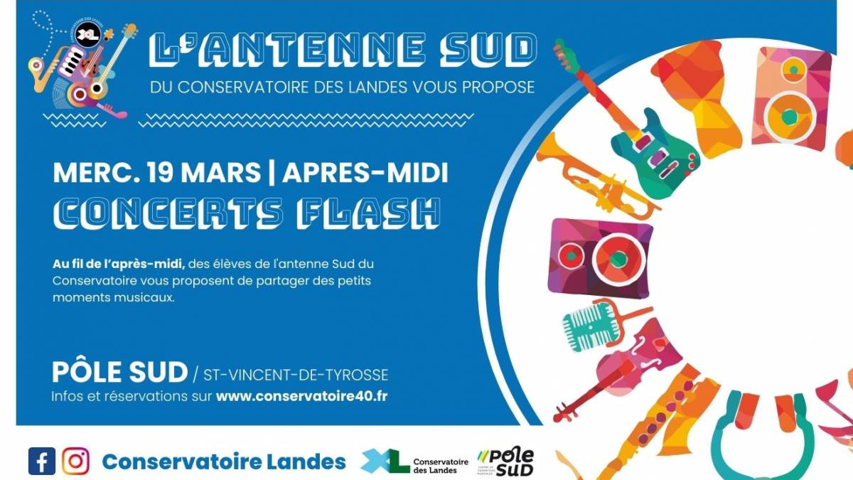 [ ANTENNE SUD ] CONCERTS FLASH [ ANTENNE SUD ] CONCERTS FLASH Publié le 04 février 2025 / Dernière modification le 17 mars 2025 [ ANTENNE SUD ] CONCERTS FLASH Publié le 04/02/2025 - Dernière modification le 17/03/2025 Tout au long de l'après midi des concerts flash des élèves du Conservatoire se succèderont - entrée libre