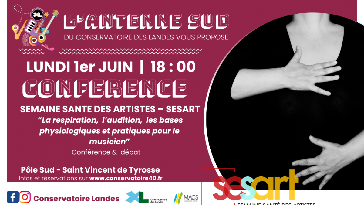 Dans le cadre de la semaine Santé des Artistes - SESART, l'Antenne Sud du Conservatoire vous propose une conférence suivie d'un débat autour de la respiration, l'audition, les bases physiologiques et pratiques pour le musicien. Deux temps forts animés par des professionnels de santé et des enseignants du CDL.
